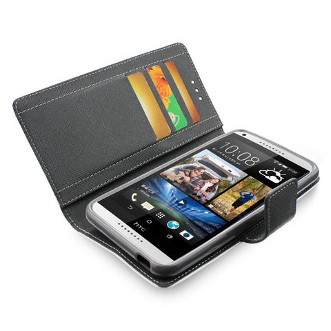 Three side pockets for credit cards, business cards and other daily "must-have" items. The free stand function makes you watch videos or pictures In an easy way. Secure magnetic flap to keep case closed and your phone scratch-free. Able to fit In pouches, bags or any other small pocket spaces. Quality-crafted for precise fit and easy operation. Made with synthetic leather exterior with a soft, microfiber interior for drop and shock protection. Complete and stylish protection with full access to all ports, buttons, and camera. This phone model is also known as HTC Desire 816/ Desire 8.