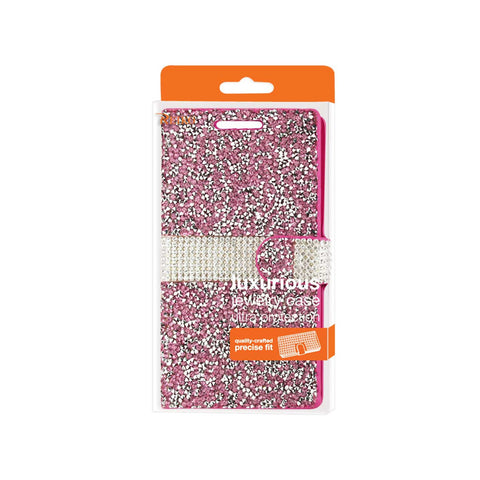 Beautiful jewelry rhinestone wallet case. Built In side pockets for credit cards, business cards and other daily "must-have" items. Secure magnetic flap to keep case closed and your phone scratch-free. Snug fitting holds your phone firmly. Wallet case covers your phone entirely. Well cutout ports for your earbuds or headphones and USB charging cable.