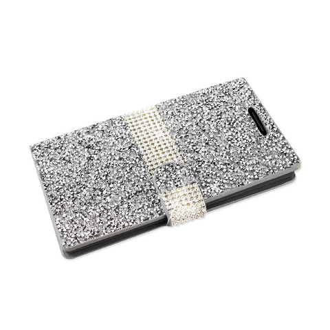 Beautiful jewelry rhinestone wallet case. Built In side pockets for credit cards, business cards and other daily "must-have" items. Secure magnetic flap to keep case closed and your phone scratch-free. Snug fitting holds your phone firmly. Wallet case covers your phone entirely. Well cutout ports for your earbuds or headphones and USB charging cable.