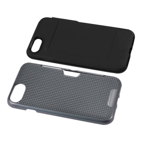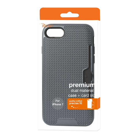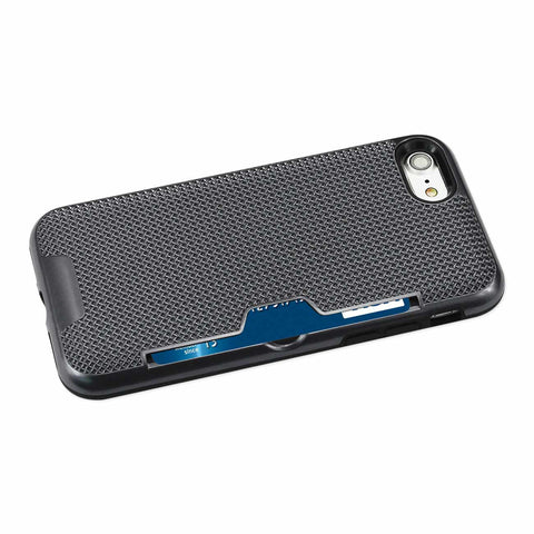 Dual layer hybrid with card holder. Slim mesh surface armor case can fit almost anywhere. Made with open slot on the back of the case to store personal card. Easy to slide In and out of pocket. Well cutout for buttons and audio plug great protection.