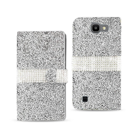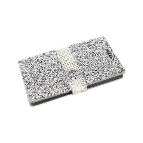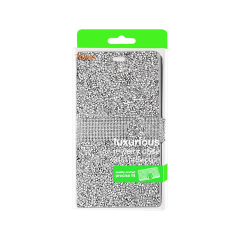 Beautiful jewelry rhinestone wallet case. Built In side pockets for credit cards, business cards and other daily "must-have" items. Secure magnetic flap to keep case closed and your phone scratch-free. Snug fitting holds your phone firmly. Wallet case covers your phone entirely. Well cutout ports for your earbuds or headphones and USB charging cable. This phone model is also known as LG Spree/ LG K120.