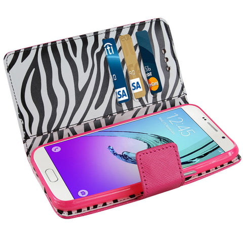 Made with magnetic closure that keeps the case closed and your phone secured. Inner zebra print wallet case made with synthetic leather so it not only looks good but it feels good. Open slots to store your debit, credit, business, cash and other personal cards on the side. Made with inner rubber bumper, it can be stretched to fit your phone greatly. Precise cutouts on the edges of the case. Wallet case folds back into a hands free viewing stand.