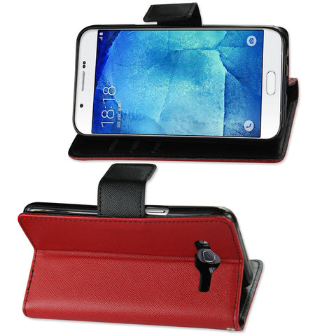 Three side pockets for credit cards, business cards and other daily "must-have" items. The free stand function makes you watch videos or pictures In an easy way. Secure magnetic flap to keep case closed and your phone scratch-free. Able to fit In pouches, bags or any other small pocket spaces. Quality-crafted for precise fit and easy operation. Made with synthetic leather exterior with a soft, microfiber interior for drop and shock protection. Complete and stylish protection with full access to all ports, buttons, and camera. This phone model is also known as Samsung Galaxy A8/ SM-A8000.