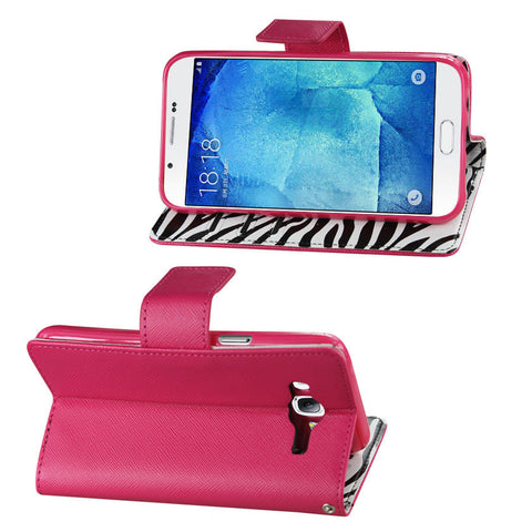 Made with magnetic closure that keeps the case closed and your phone secured. Inner zebra print wallet case made with synthetic leather so it not only looks good but it feels good. Open slots to store your debit, credit, business, cash and other personal cards on the side. Made with inner rubber bumper, it can be stretched to fit your phone greatly. Precise cutouts on the edges of the case. Wallet case folds back into a hands free viewing stand. This phone model is also known as Samsung Galaxy A8/ SM.