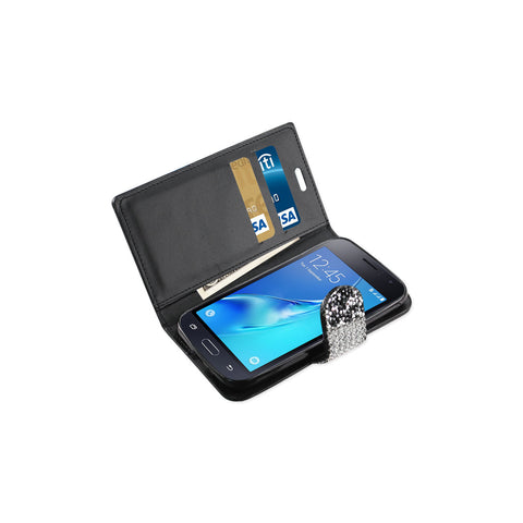 Beautiful jewelry rhinestone wallet case. Built In side pockets for credit cards, business cards and other daily "must-have" items. Secure magnetic flap to keep case closed and your phone scratch-free. Snug fitting holds your phone firmly. Wallet case covers your phone entirely. Well cutout ports for your earbuds or headphones and USB charging cable. This phone model is also known as SAMSUNG GALAXY J1 (2016).