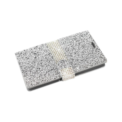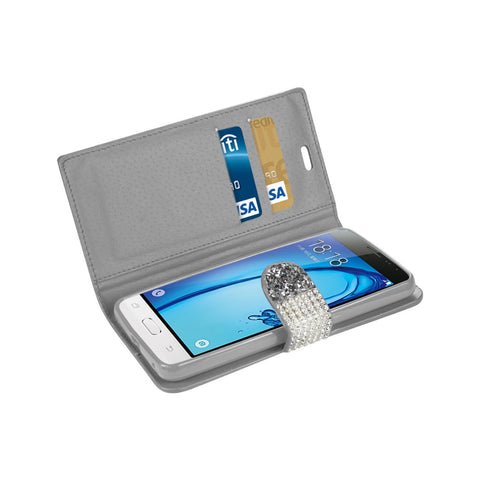 Beautiful jewelry rhinestone wallet case. Built In side pockets for credit cards, business cards and other daily "must-have" items. Secure magnetic flap to keep case closed and your phone scratch-free. Snug fitting holds your phone firmly. Wallet case covers your phone entirely. Well cutout ports for your earbuds or headphones and USB charging cable. This phone model is also known as Samsung Galaxy J3/ Samsung SM-J320P.