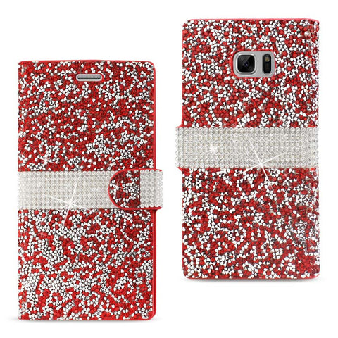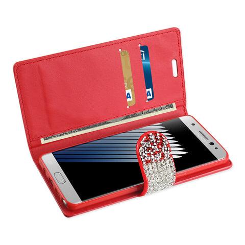 Beautiful jewelry rhinestone wallet case. Built In side pockets for credit cards, business cards and other daily "must-have" items. Secure magnetic flap to keep case closed and your phone scratch-free. Snug fitting holds your phone firmly. Wallet case covers your phone entirely. Well cutout ports for your earbuds or headphones and USB charging cable. This phone model is also known as Samsung Galaxy Note 7/ Samsung Galaxy Note 6.