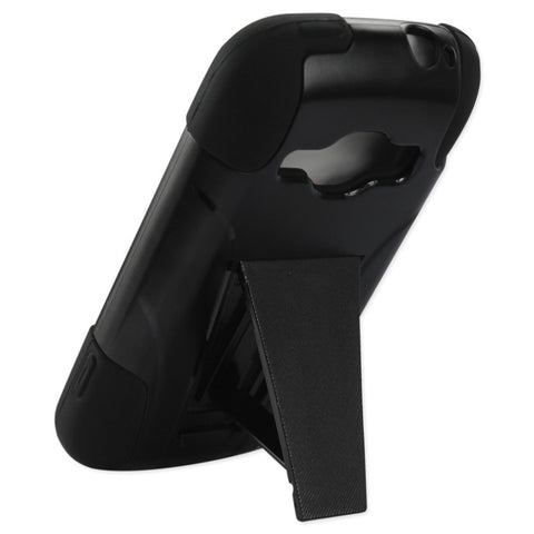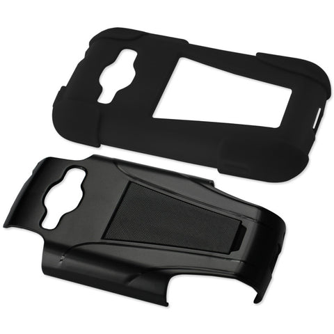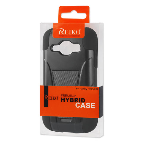 Constructed from impact-resistant material and double-enforced with a shock absorbing silicone inner-sleeve. Built In vertical kickstand. Heavy duty design with front raised edges to protect your mobile device and touchscreen. Protects your phone under extreme conditions and a host of other environmental factors great dropproof and shockpoorf protection. This phone model is also known as Samsung Galaxy Ring/ Prevail 2 M840.