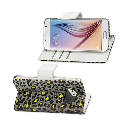 Beautiful synthetic leather with leopard print. Three side pockets for credit cards, business cards and other daily "must-have" items. The free stand function makes you watch videos or pictures In an easy way. Secure magnetic flap to keep case closed and your phone scratch-free. Able to fit In pouches, bags or any other small pocket spaces. Quality-crafted for precise fit and easy operation. Complete and stylish protection with full access to all ports, buttons, and camera. This phone model is also known as Samsung Galaxy S6 SM-G920T/ G920P/ G920A/ G920V/ G920R.